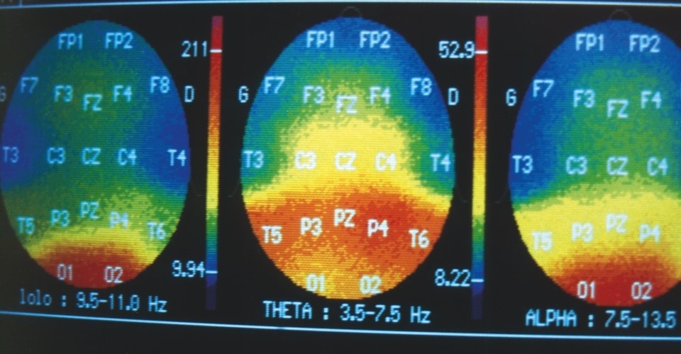 Cartographie EEG (électroencéphalogramme) montrant l’activité cérébrale dans différentes zones et fréquences d’ondes (Theta, Alpha, etc.). Ces mesures illustrent l’impact des stimulations lumineuses et sonores sur le cerveau, comme celles utilisées avec les lunettes, qui favorisent relaxation, concentration et états de conscience modifiés.